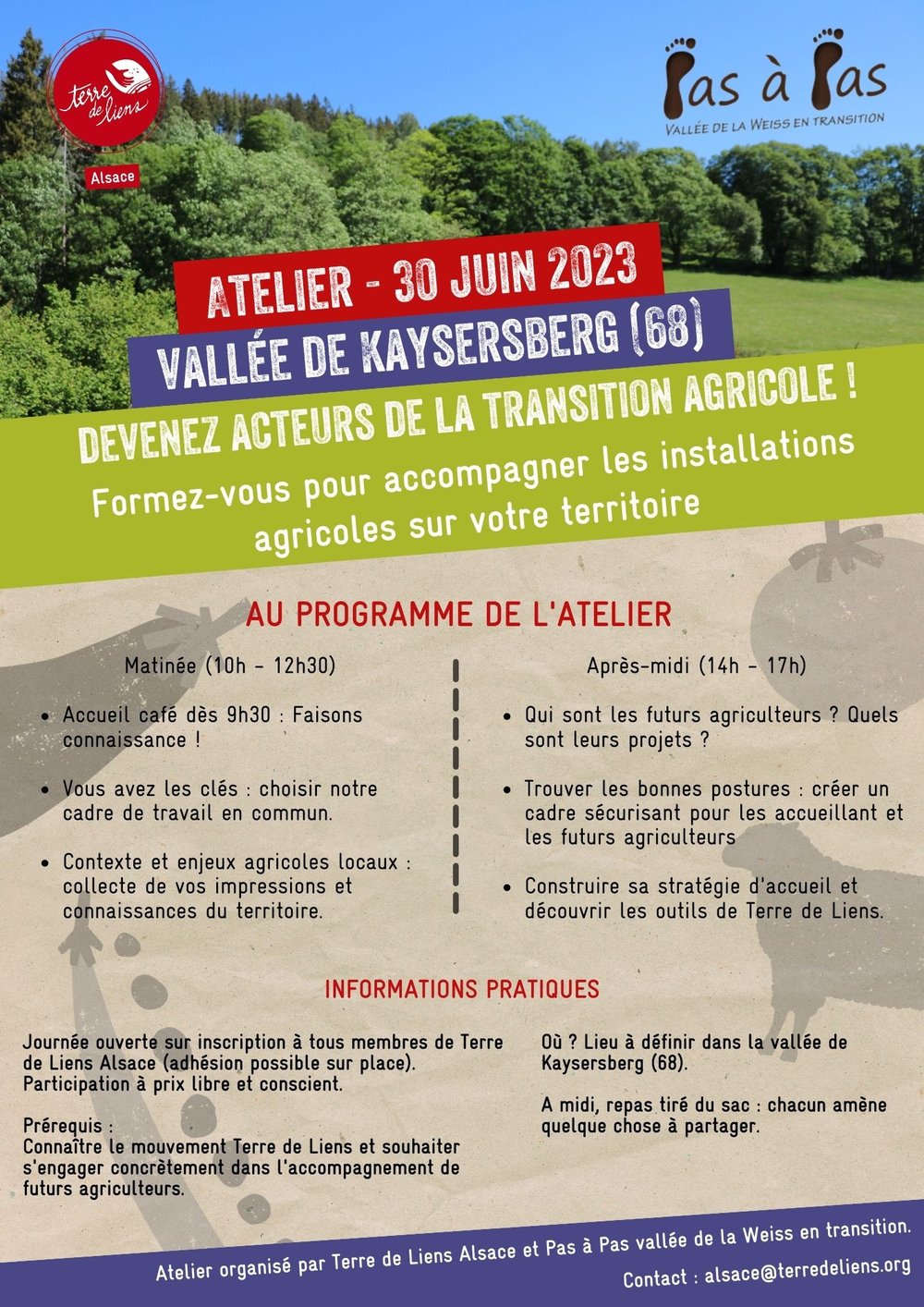 Terre de Liens Alsace et Pas à pas - vallée de la Weiss en transition - vous invitent à devenir acteurs de la transition agricole...chez vous ! Venez vous former pour accompagner les installations agricoles sur votre territoire !