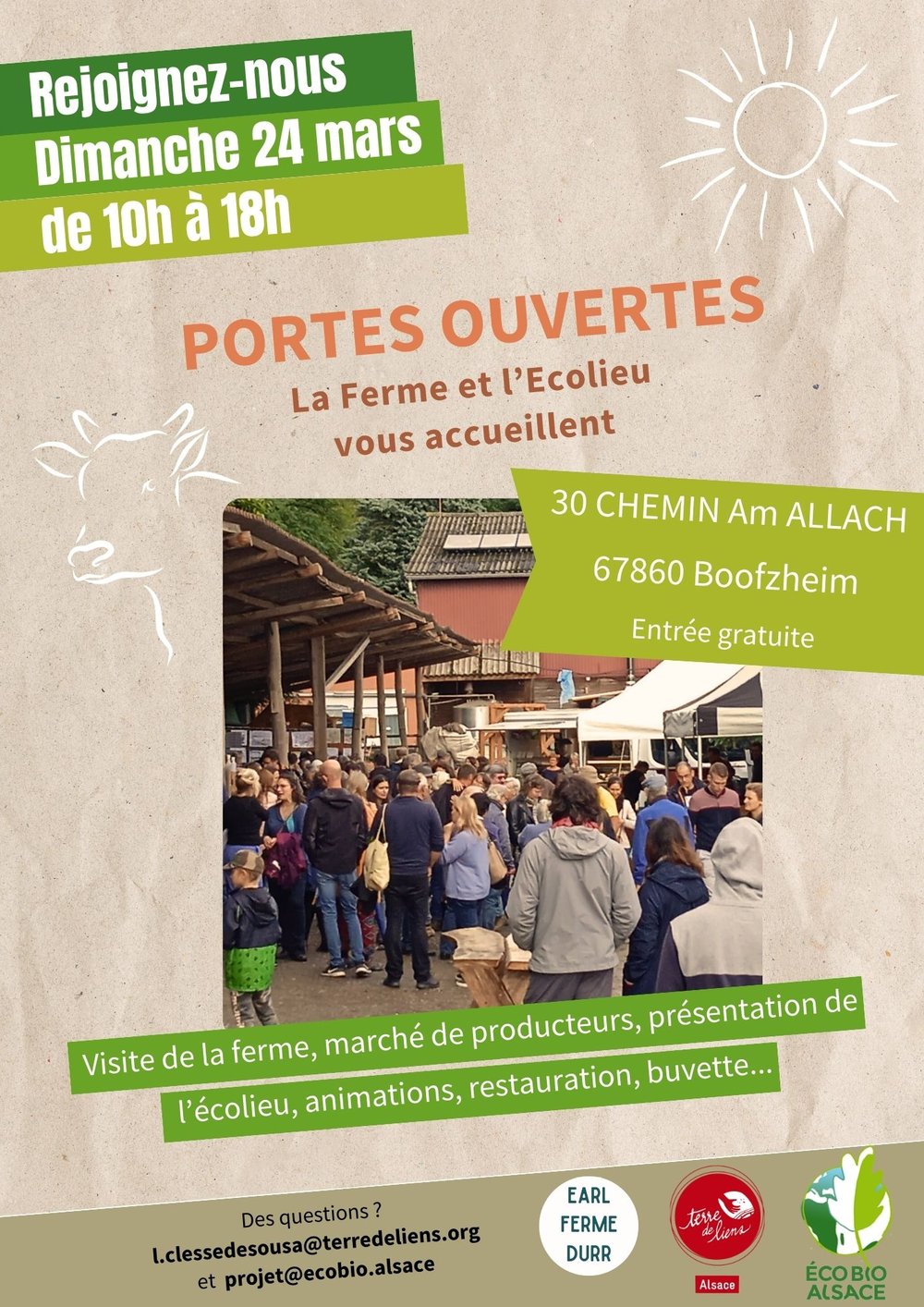 A l'occasion de ces portes ouvertes venez découvrir l'EARL Ferme Durr soutenu par Terre de Liens Alsace, et l'Ecolieu de l'association Eco bio Alsace.