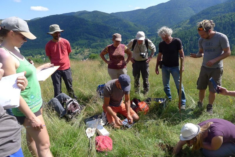 Le lendemain matin, Jude nous transmet quelques bases théoriques. Il s’agit de comprendre ce qu’est le sol, résultat de la rencontre entre le minéral et l’organique, puis de passer en revue les aspects permettant d’évaluer sa résilience et sa fertilité. Après une démonstration pratique dans un pré, l’après-midi est une suite d’observations et relevés sur 3 autres prairies ; c’est l’occasion pour les participants d’apprendre en faisant. Et c’est sous l’œil vigilant de Francis que Jude creuse (et fait creuser) de jolis trous. Nous mettons ainsi à jour 3 niveaux d’observation, ou "horizons", et notons tout d’abord la qualité de la terre (argileuse, limoneuse ou sableuse), puis observons les racines, avant d’analyser la struc-ture du sol, et enfin sa compacité ou aération. Pour finir, des relevés de pH et de conductivité électrique sont réalisés.