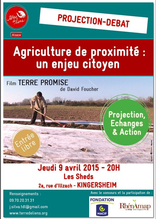 Terre de liens Alsace vous invite à une rencontre autour de la projection du film Terre Promise le jeudi 9 avril à 20h pour échanger sur les possibilités d’actions concrètes, dans les locaux des Sheds à Kingersheim.