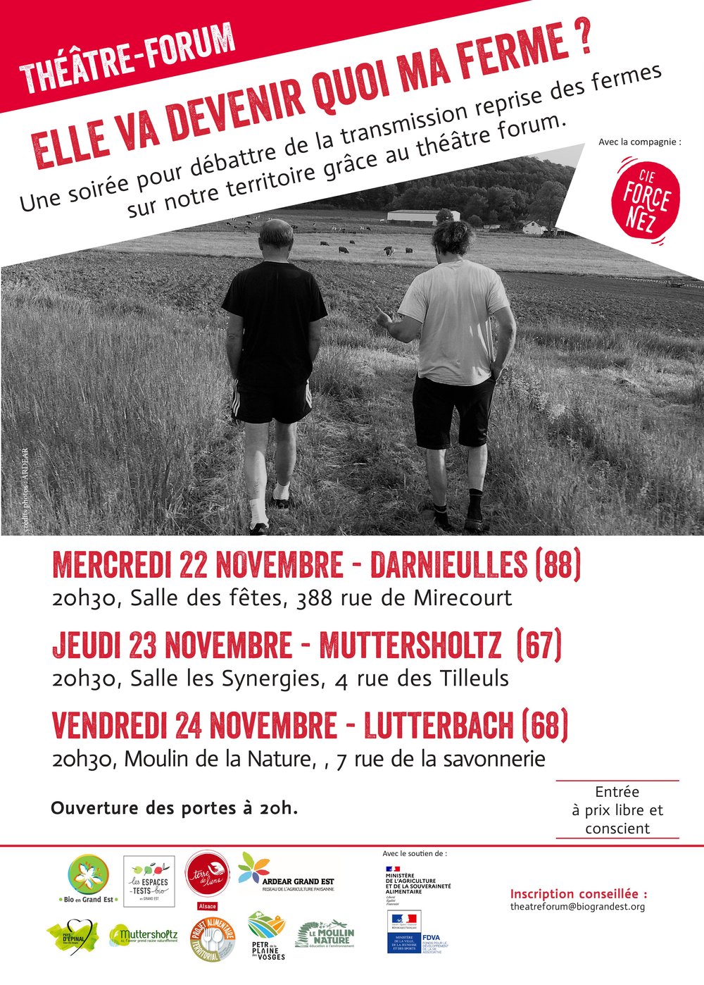 La compagnie Force Nez s’invite en Alsace et dans les Vosges pour aborder de manière ludique la thématique de la transmission des fermes ! La représentation de la pièce intitulée "Elle va devenir quoi ma ferme ?" sera suivie d’un temps d’échange.