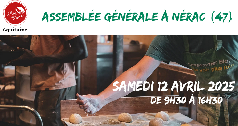 Inscription nécessaire pour le repas sur ce lien jusqu'au 7 avril: https://framaforms.org/ag-terre-de-liens-aquitaine-12-avril-nerac-1740739682