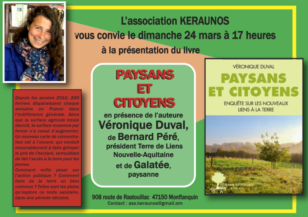 Dimanche 24 mars à 17h à Monflanquin, en Lot-et-Garonne, Véronique Duval viendra dédicacer son livre Paysans et Citoyens: enquête sur les nouveaux liens à la terre, à l'invitation de l'association Keraunos.