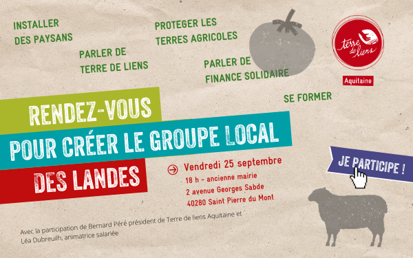 Cette réunion sera l’occasion de vous présenter le mouvement Terre de Liens et nos actions en Aquitaine. Vous pourrez y rencontrer Bernard Péré président de Terre de liens Aquitaine, Sébastien Galloy, premier candidat à l’installation dans les Landes, à Créon d’Armagnac, qui nous présentera son projet et moi même, Léa Dubreuilh, animatrice salariée.