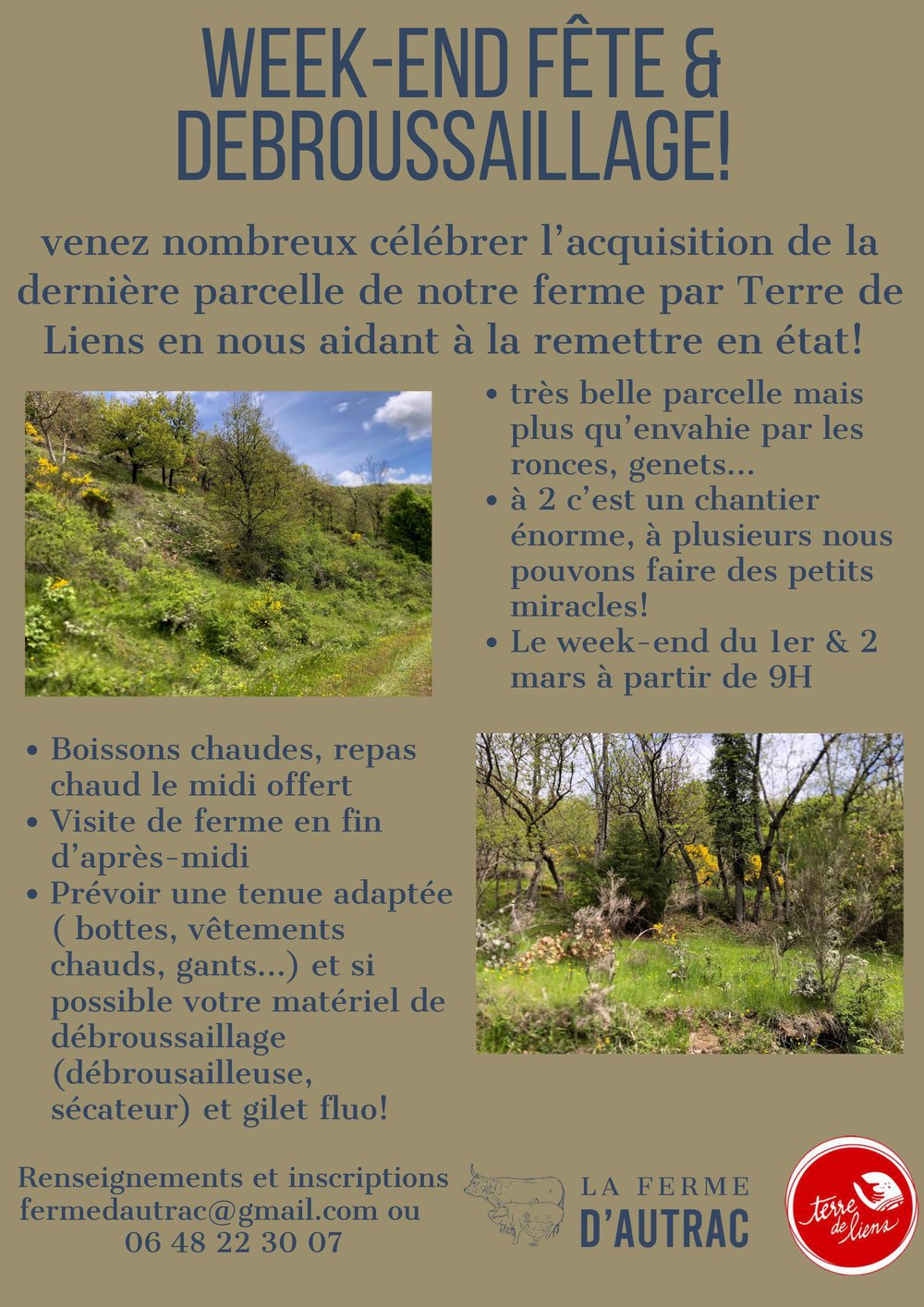Venez nombreux célébrer l'acquisition de la dernière parcelle de la Ferme d'Autrac par Terre de Liens, en aidant à la remettre en état.