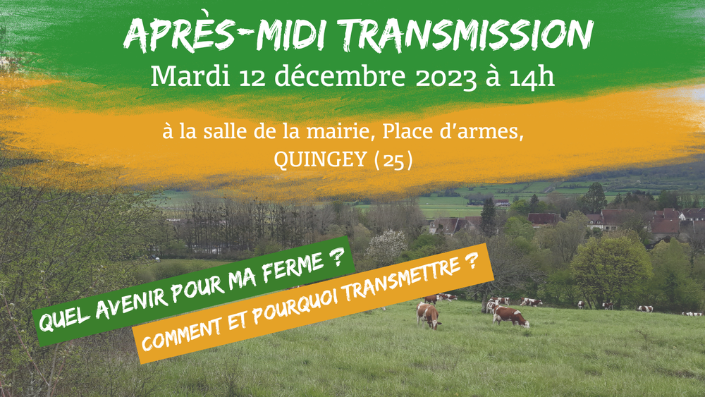 Le collectif InPACT25, « Initiative pour une Agriculture Citoyenne et Territoriale », composé des associations Accueil Paysan, Solidarité Paysans 25, Afocg25, Terre de Liens BFC et MRJC et en partenariat avec la Chambre Interdépartementale d’Agriculture du Doubs Territoire de Belfort, a le plaisir de vous convier à une après-midi d’échanges consacrée à la transmission des fermes.