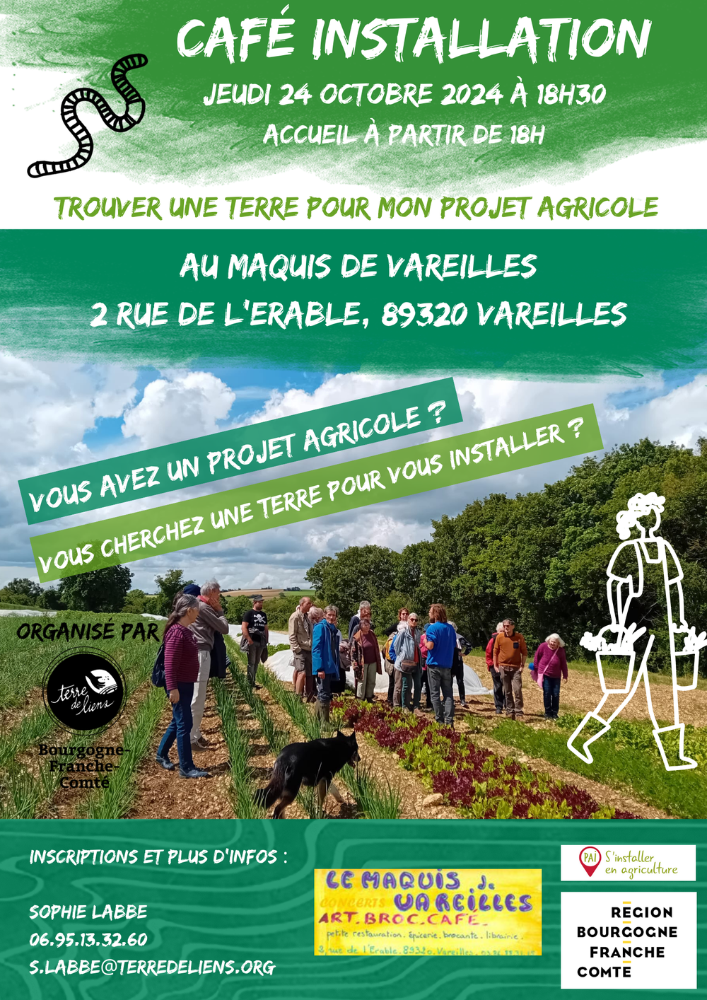 Ce Café Installation, organisé en partenariat le Maquis de Vareilles, est à destination des porteurs de projets qui souhaitent s'installer en agriculture ou conforter leur exploitation. Cette rencontre est également à destination des agriculteurs du territoire qui souhaiteraient venir échanger sur les enjeux de l'accès au foncier localement et/ou pour y rencontrer de potentiels repreneurs.