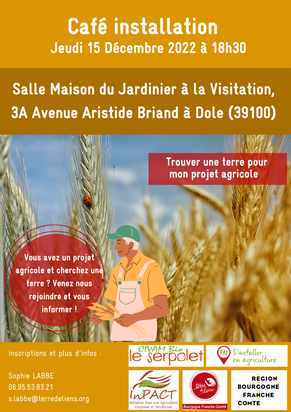 Ce Café Installation, organisé en partenariat avec le Point Accueil Installation 39, est à destination des porteurs de projets qui souhaitent s'installer en agriculture ou conforter leur exploitation. Ce sera l'occasion d'échanger avec les membres du collectif InPACT Jura, mais aussi avec la Chambre d'Agriculture du Jura, la SAFER et nos agriculteurs témoins au sujet de l’accès au foncier et de la recherche de terres, en cohérence avec son projet agricole.