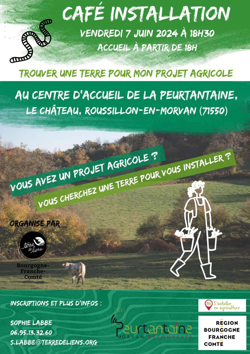 Ce Café Installation, organisé en partenariat avec le Point Accueil Installation 71 et l'Association Morvan Découverte, est à destination des porteurs de projets en recherche de terres pour s'installer en agriculture ou pour conforter leur exploitation. Cette rencontre est également à destination des agriculteurs du territoire qui souhaiteraient venir rencontrer et échanger avec de potentiels repreneurs. Ce sera l'occasion d'échanger avec Terre de Liens, le Point Accueil Installation et la SAFER, ainsi qu’avec nos témoins autour des questions d'accès au foncier et de la recherche de terres, en cohérence avec son projet agricole.