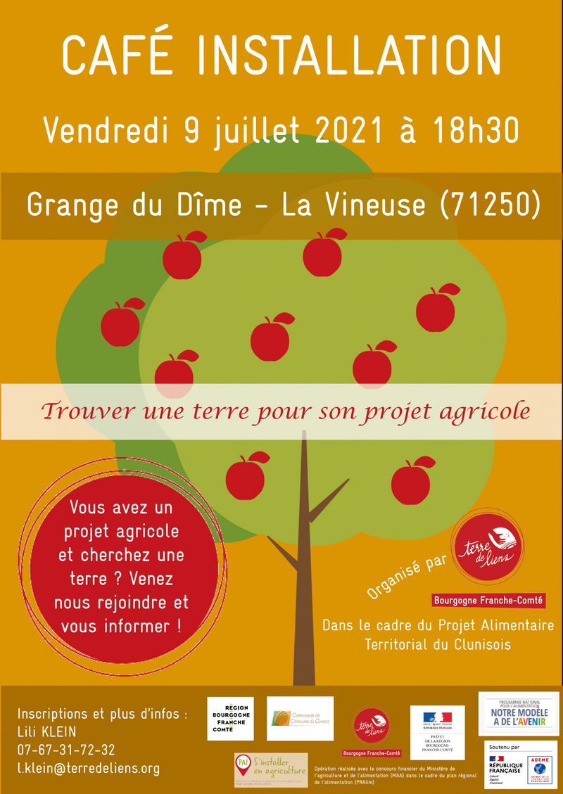 Vendredi 9 juillet à 18h30, Terre de Liens Bourgogne-Franche-Comté organise un café installation autour de la recherche de foncier. Il aura lieu à la Grange du Dîme à La Vineuse (71250)Réservation auprès de Orianne GUILLOU : 06-95-53-83-21 ou bfc(a)terredeliens.org
