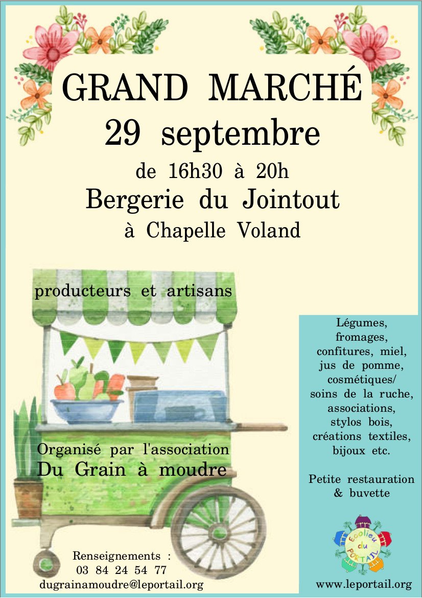 L’association Du Grain à Moudre organise un grand marché de producteurs et artisans le vendredi 29 septembre de 16h30 à 20h, devant la bergerie de la ferme Terre de Liens la Ferme du Jointout à Chapelle Voland (39).