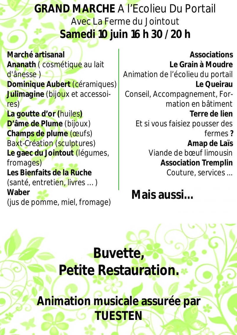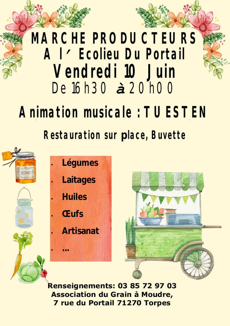 Nous avons le plaisir de vous inviter à visiter les stands du marché : vendredi 10 juin de 16h30 à 20h, sur l’écolieu du Portail, 7 rue du Portail - 71270 Torpes.