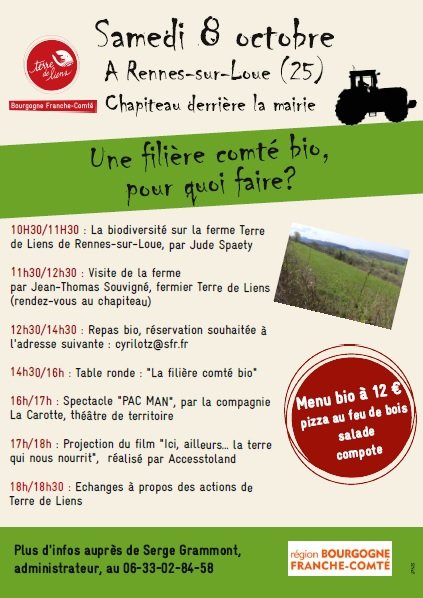 Samedi 8 octobre, de 10h30 à 18h30, Terre de Liens BFC vous invite à participer à une journée autour de la ferme de la Loue. Entrée libre. Repas bio le midi à 12 euros.