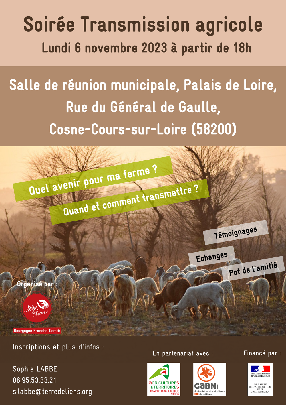 L’association Terre de Liens Bourgogne-Franche-Comté organise, aux côtés du Point Accueil Transmission de la Chambre d’Agriculture de la Nièvre et du GABNi, une rencontre sur la thématique de la transmission agricole.