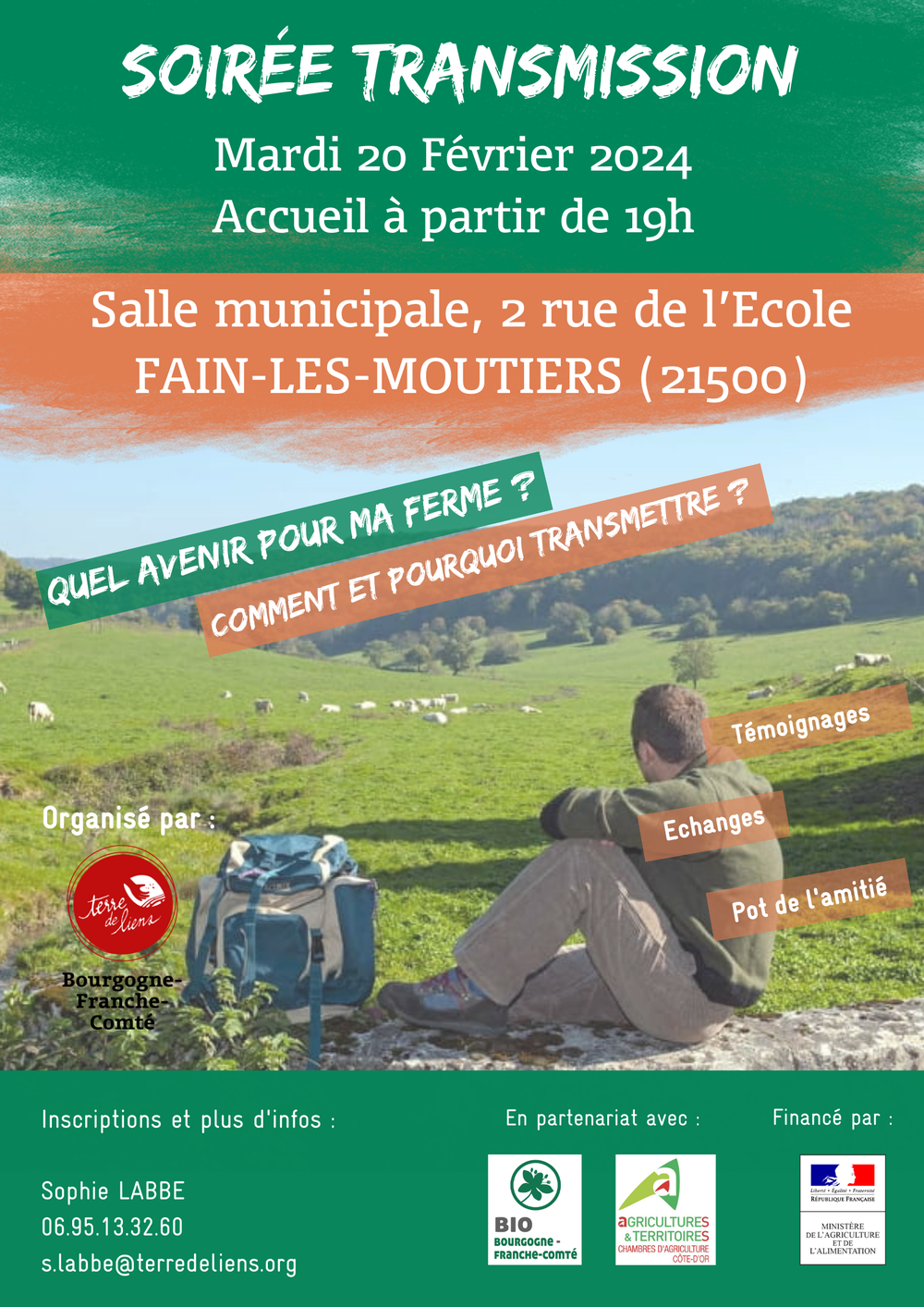 L’association Terre de Liens Bourgogne-Franche-Comté organise, aux côtés du Point Accueil Transmission de la Chambre d’Agriculture de Côte d’Or, de Bio Bourgogne-Franche-Comté et de la commune de Fain-lès-Moutiers, une rencontre sur la thématique de la transmission agricole.
