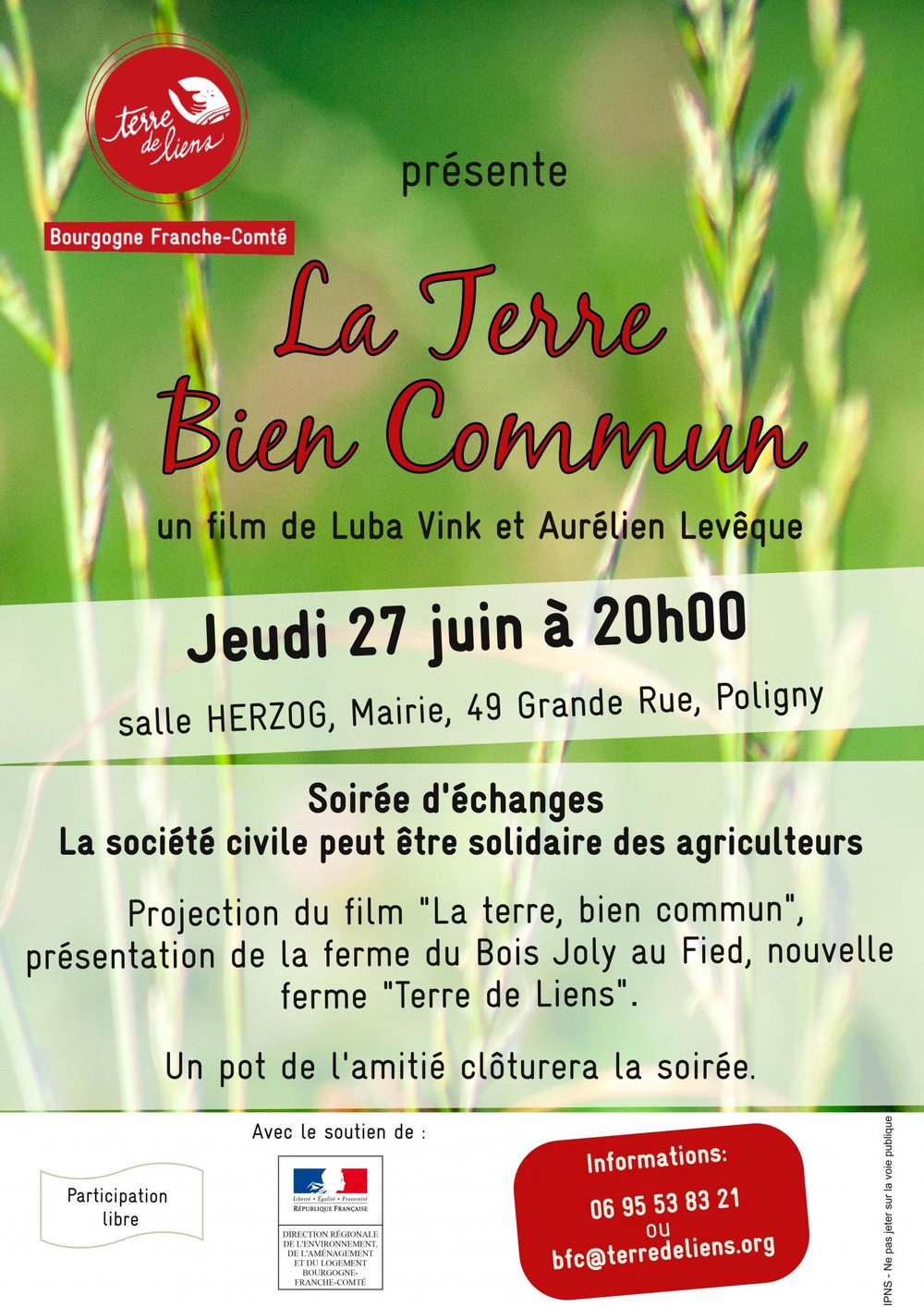 L’association Terre de Liens BFC a le plaisir de présenter la nouvelle acquisition de la Foncière Terre de Liens, la ferme du Bois Joly, productrice de lait à comté bio, située au Fied. Nous organisons pour l’occasion une soirée d’échanges, dédiée à la présentation de ce projet, avec la projection du film "La Terre Bien Commun".