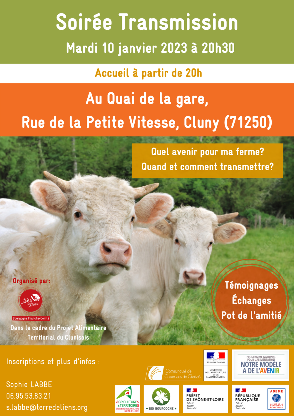 L’association Terre de Liens Bourgogne-Franche-Comté, aux côtés du Point Accueil Transmission de la Chambre d’Agriculture de la Saône-et-Loire, de Bio Bourgogne et de la communauté de communes du Clunisois dans le cadre de son Projet Alimentaire Territorial, organise une soirée sur la thématique de la transmission agricole.