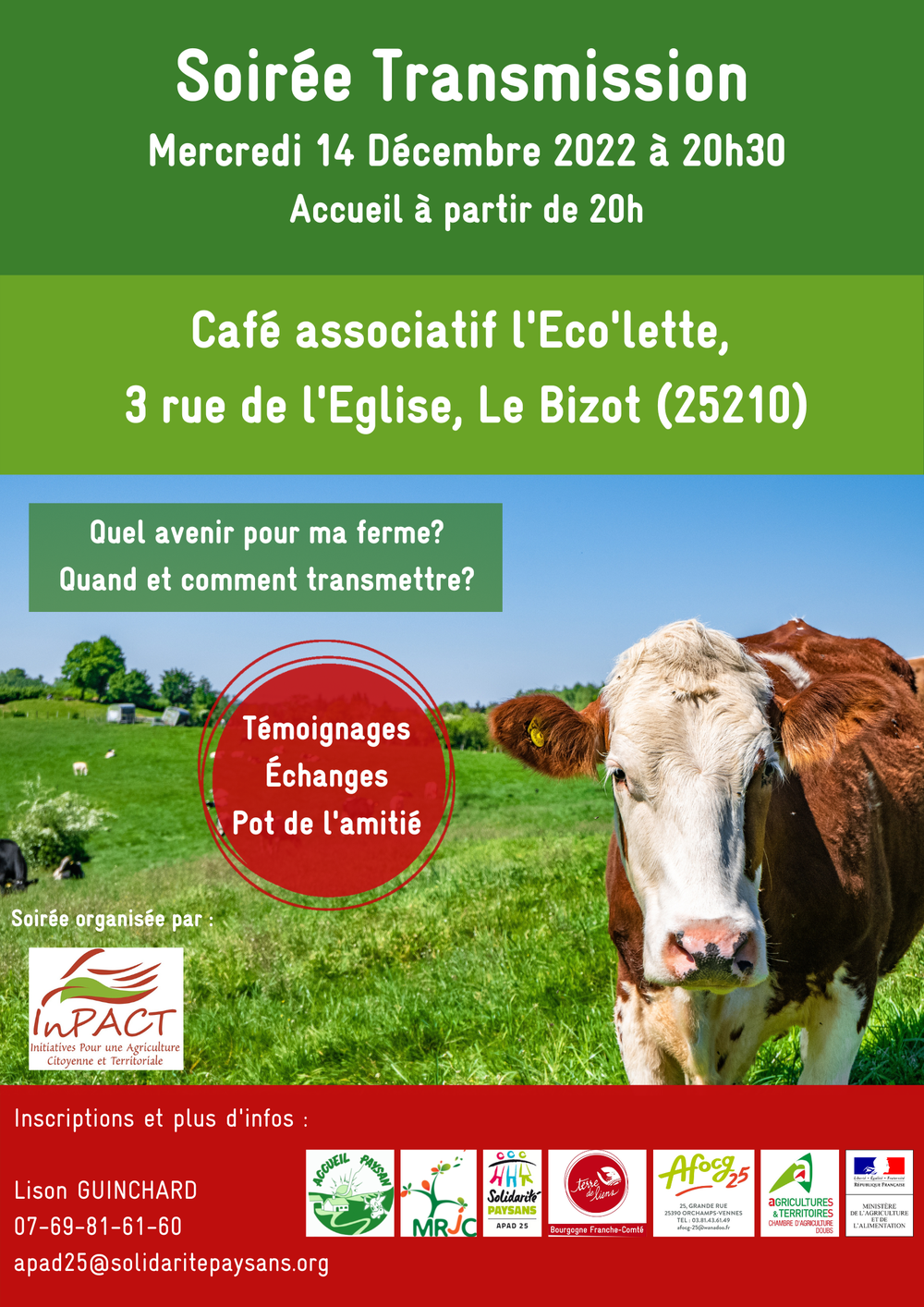 Le collectif InPACT25, « Initiative pour une Agriculture Citoyenne et Territoriale », composé des associations Accueil Paysan, Solidarité Paysans - APAD25, Afocg25, Terre de Liens BFC et MRJC et en partenariat avec la Chambre d’Agriculture du Doubs, a le plaisir de vous convier à une soirée d’échanges consacrée à la transmission des fermes.