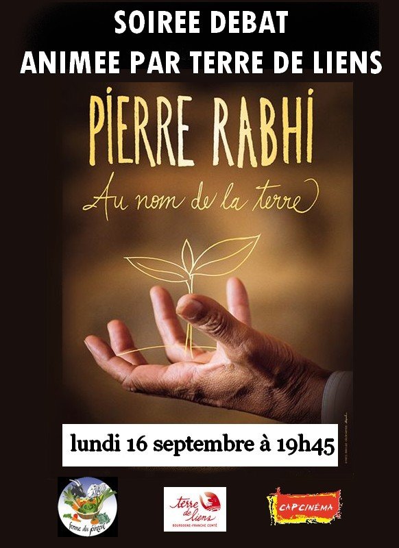 Terre de Liens Bourgogne Franche -Comté, La Ferme du Jointout(TORPES 71) et Cap cinéma de Beaune s’associent pour organiser la diffusion du film 'Pierre Rabhi Au nom de la terre' réalisé par Marie-Dominique Dhelsing : 'Pierre Rabhi est paysan, écrivain et penseur. Il est l’un des pionniers de l’agro-écologie en France. Amoureux de la Terre nourricière, engagé depuis quarante ans au service de l’Homme et de la Nature, il appelle aujourd’hui à l’éveil des consciences pour construire un nouveau modèle de société où « une sobriété heureuse » se substituerait à la surconsommation et au mal-être des civilisations contemporaines.'La projection débutera à 19H45 sera suivi d’un débat avec des représentants de Terre de Liens et un des fermiers pour aborder avec ceux qui le désireront la place des citoyens dans les problématiques de terre agricole et plus largement dans l’agriculture de demain.Prix d’entrée : 5,80Euros