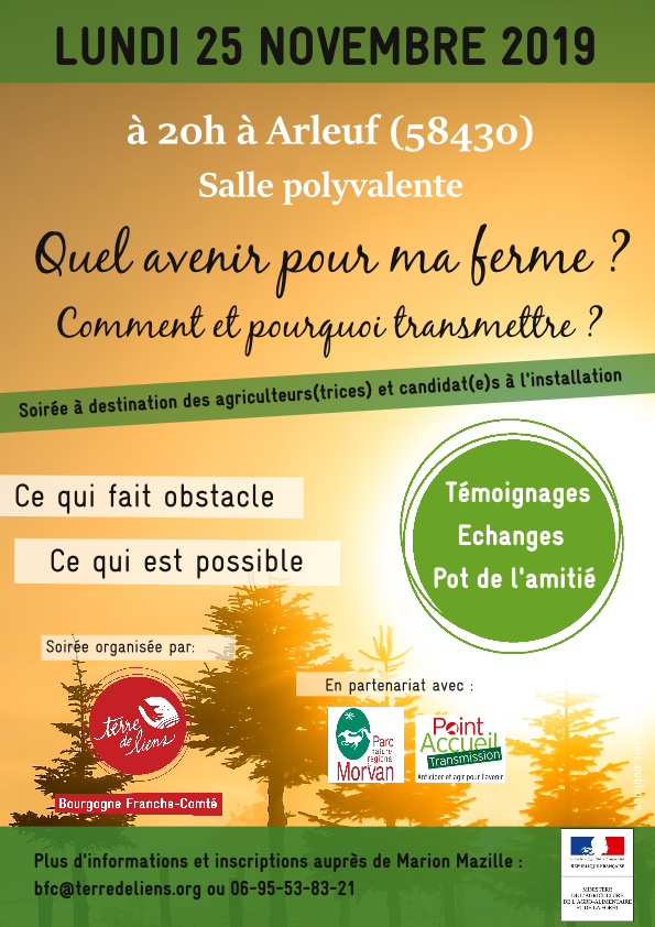 Au programme de cette soirée organisée : courte projection d’un film abordant la question de la transmissiion en territoire rural, témoignage d’un agriculteur ayant transmis sa ferme, débat et échange avec les participants et pot de l’amitié pour délayer et continuer la discussion.