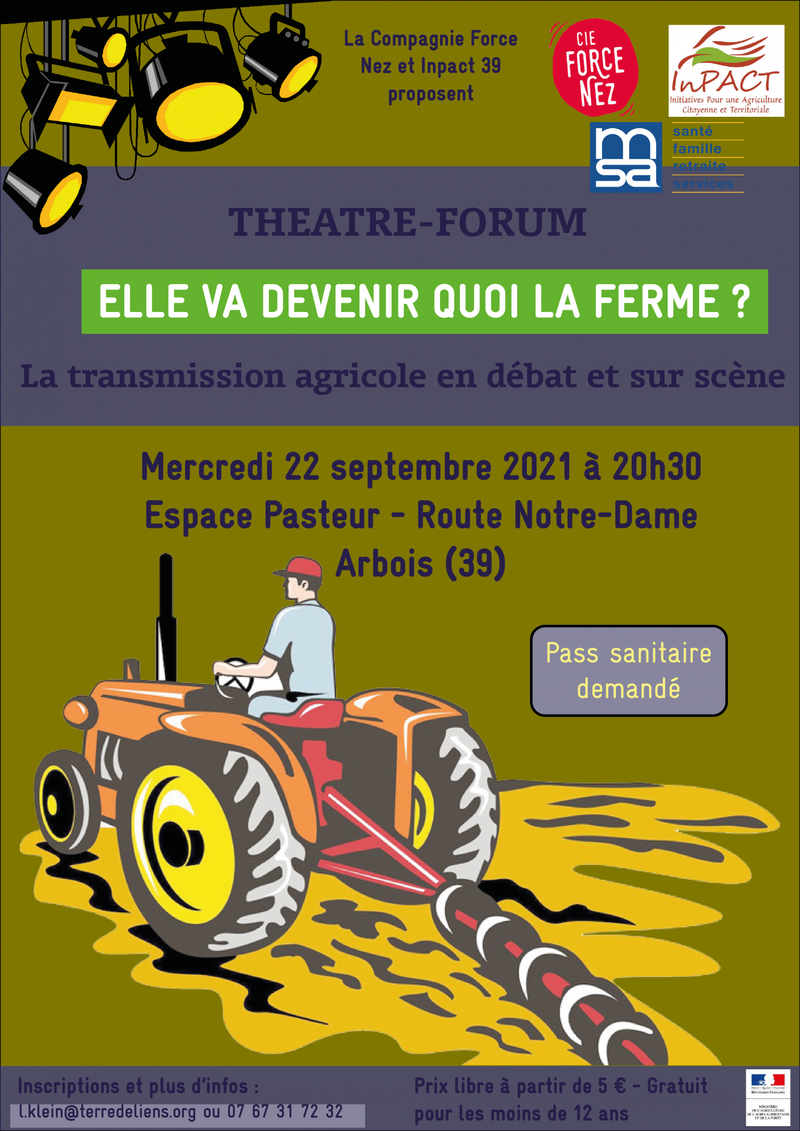 Le théâtre-forum est une pratique interactive dans laquelle le public devient acteur de la soirée, cela permet de faire émerger la parole et d’échanger ensemble autour des problématiques de transmission agricole. Un verre de l’amitié sera proposé à l’issue de la représentation.