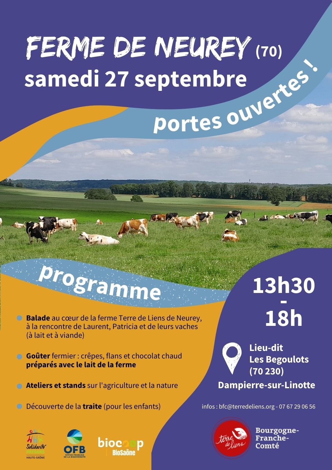 ✨Rendez-vous à 13h30 : après un bon café chaud, vous suivrez Laurent et Patricia pour une balade à la rencontre de leurs vaches élevées en plein air qui, quand elles ne pâturent pas, sont nourries avec des fourrages issus des prairies de la ferme. Vous découvrirez les secrets de la production de lait bio, depuis la prairie jusqu’au verre, et comprendrez pourquoi la démarche de la ferme respecte autant l’environnement que notre santé. Petit·es et grand·es pourront approcher les animaux, poser toutes leurs questions, et partager un moment authentique au rythme de la ferme.