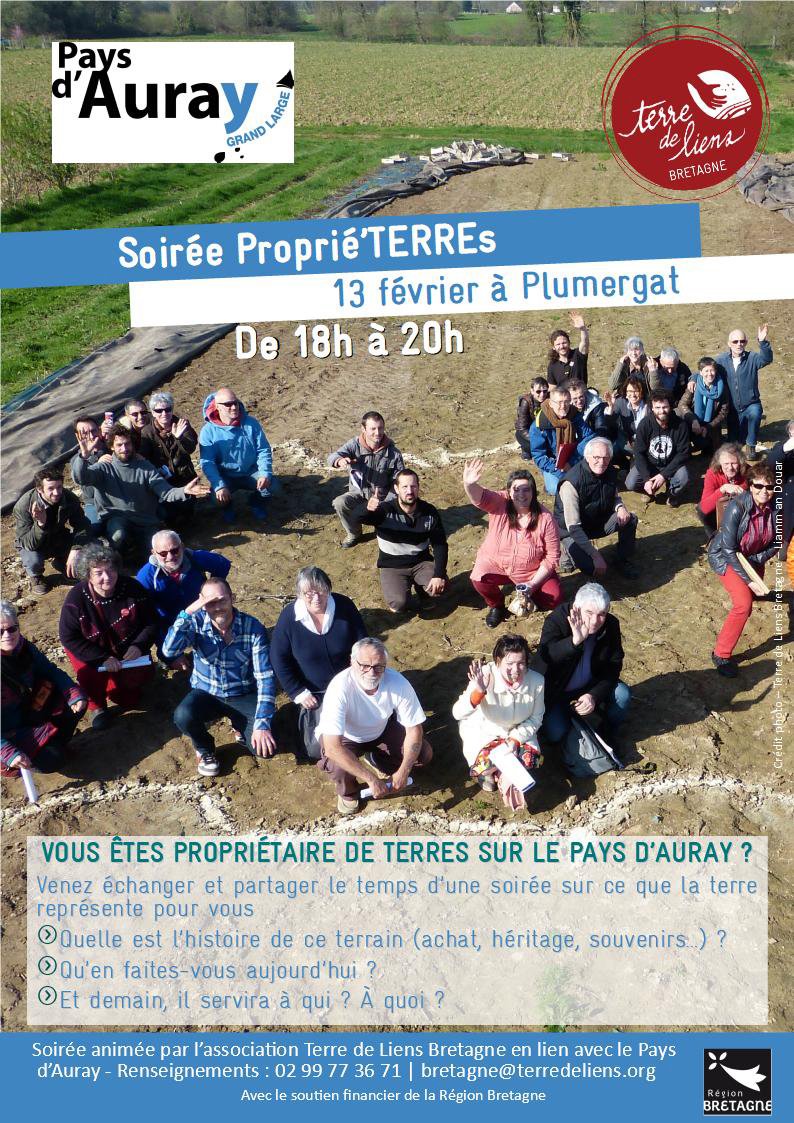 Vous êtes propriétaires de terres sur le Pays d’Auray ? Venez échanger et partager le temps d’une soirée sur ce que la terre représente pour vous : Quelle est l’histoire de ce terrain (achat, héritage, souvenir …) ? Qu’en faites-vous aujourd’hui ? Et demain, à qui servira-t-il ? A quoi ?