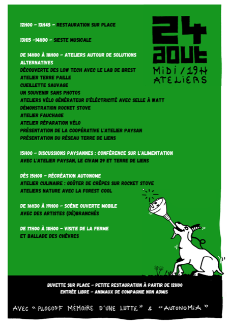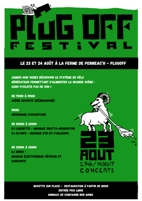 Fabien, fermier Terre de Liens, organise avec ses comparses le PLUG OFF Festival les 23 et 24 août prochain sur sa ferme. Deux jours où sont mises à l'honneur des solutions alternatives autour de l'autonomie (énergétique, alimentaire,...). Le samedi soir aura lieu un concert où le public devra pédaler pour générer l’énergie nécessaire à l'alimentation des machines. Le 24 août après-midi auront lieu différents ateliers, du fauchage au repair'vélo.
