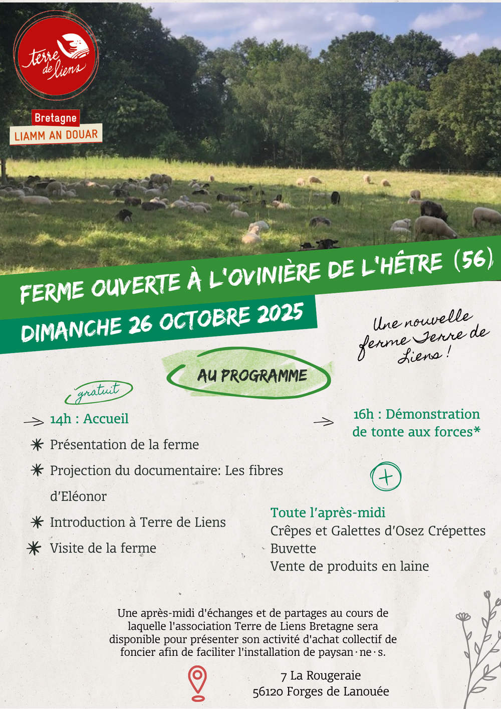 J'ai le plaisir de vous faire part de la porte ouverte sur ma ferme L'Ovinière de l'hêtre le dimanche 26 octobre 2025 de 14h à 18h. C'est pour marquer le rachat d'une partie du foncier de ma ferme par Terre de Liens. Il y aura donc une présentation de la ferme et de mon travail, de Terre de Liens, la projection d'un court documentaire sur mon travail autour de la laine réalisé par Les Passeurs d'images et de sons de Sérent, ainsi qu'une démonstration de tonte d'ovins. Une buvette sera tenue par les Amis de la Conf, et le foodtruck d'Osez Crépette sera là pour ses crêpes. En lien, le flyer de la porte ouverte, n'hésiter pas à diffuser l'information autour de vous, et à bientôt!