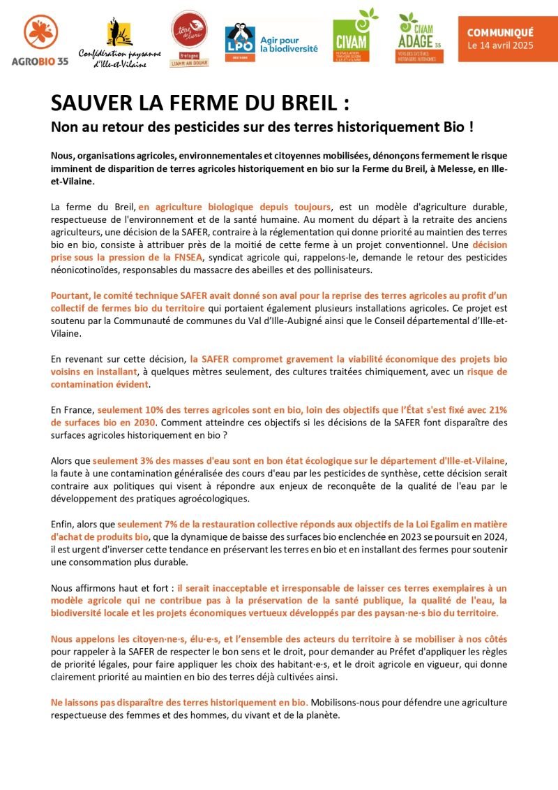 Signataires : AGROBIO 35, Confédération Paysanne, Terre de Liens, LPO Bretagne, Réseau CIVAM 35 IT, Adage 35