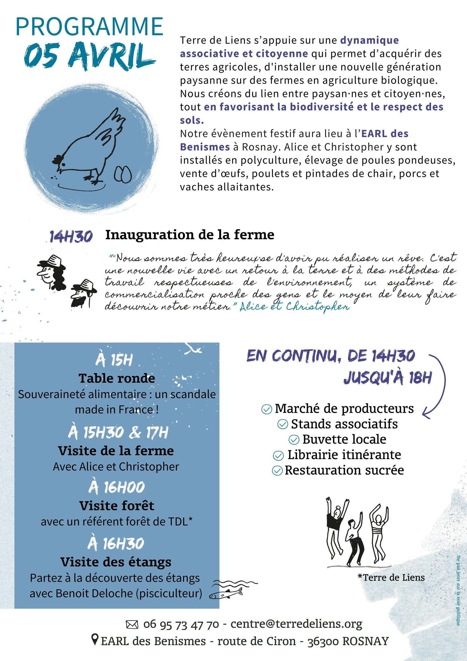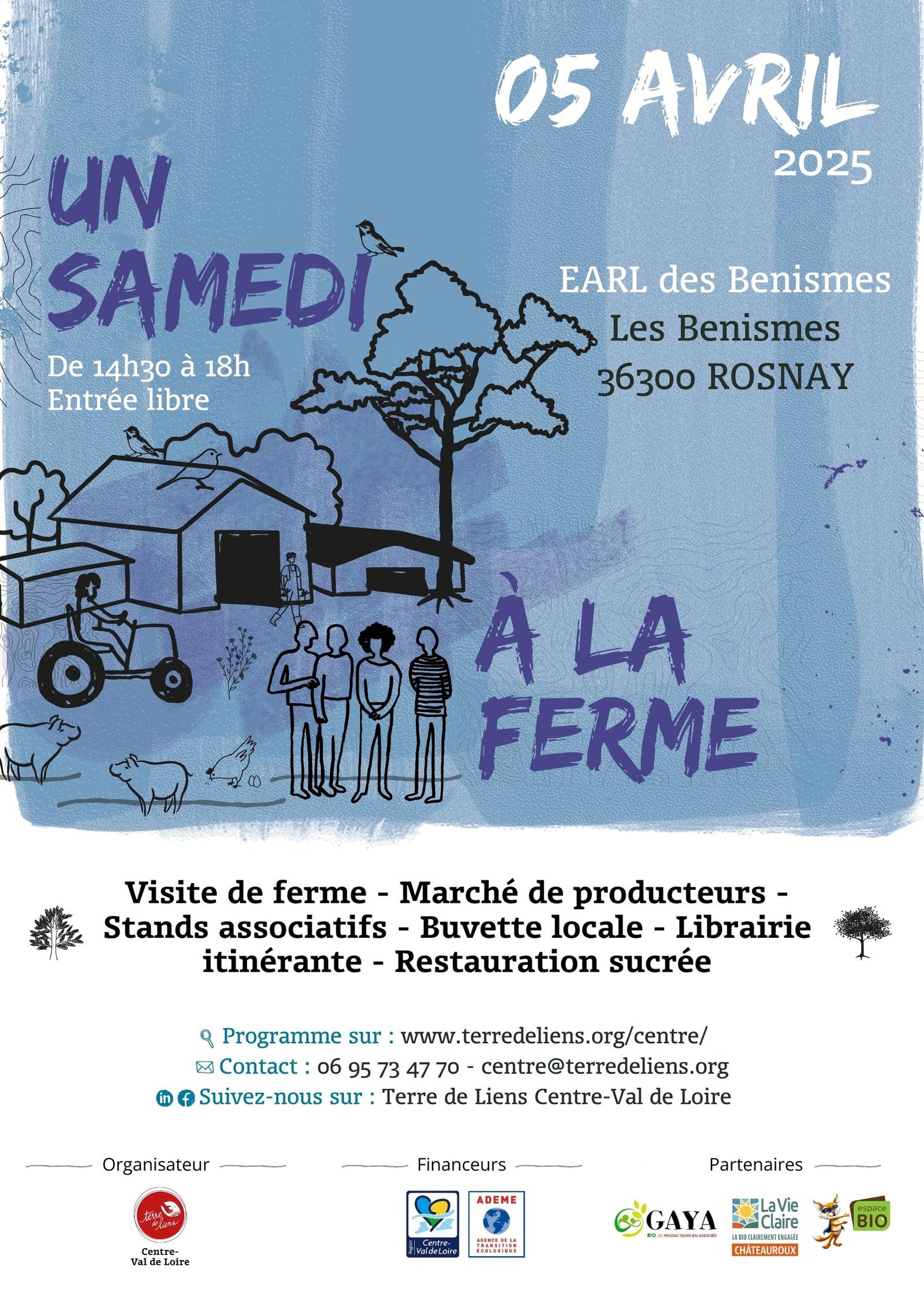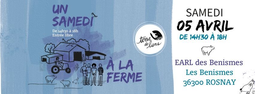 Visite de la ferme, marché de producteurs, stands associatifs, librairie itinérante, buvette et restauration sur place, voilà ce qui attend les visiteurs le samedi après- midi 5 avril prochain à la ferme des Benismes, à Rosnay, au cœur de la Brenne (36).