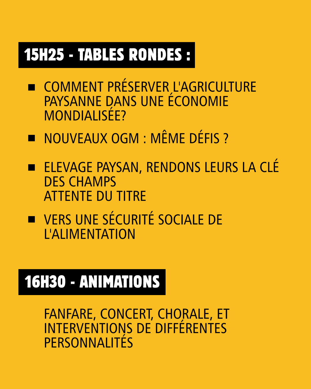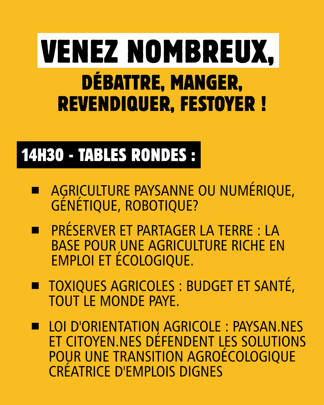 Au menu : stands associatifs, dégustations, débats paysans et citoyens, concerts, soupe populaire... pour rendre visible et tangible, la solidarité effective entre agriculture biologique, agroécologie et la société civile.