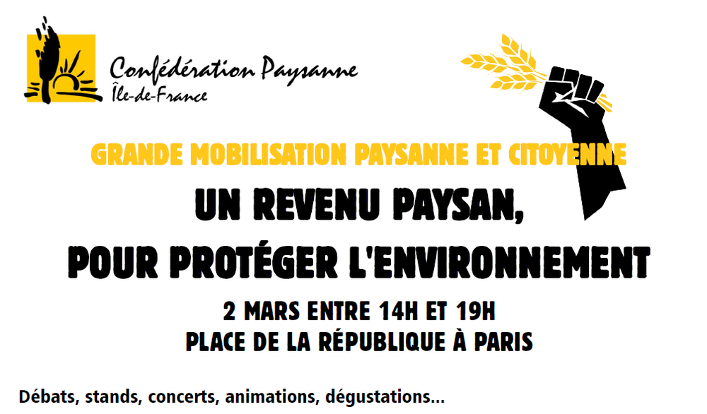Une réponse se dessine en Île-de-France : la Confédération Paysanne Île-de-France organise un rassemblement festif et engagé, le samedi 2 mars 2024 de 14h à 19h, place de la République à Paris.
