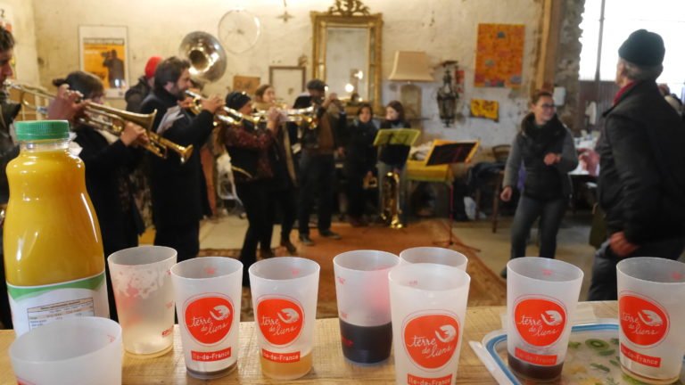 À midi, les repas sortis du sac ont été partagés, le soleil et les débats entre convives ont illuminé les visages, la fanfare a rythmé le temps qui s’est étiré joyeusement. Pour finir, la visite de la ferme nous a fait chausser de bottes pour déambuler dans la ferme, les pieds bien dans la terre (et, soyons honnêtes, dans la boue aussi, car la ferme de Combreux n’avait pas échappé aux averses des jours précédents !). La visite a été ponctuée de moments de rencontre avec des personnes impliquées pour l’acquisition par TDL d’une parcelle agricole au sein de cette ferme (salariés, bénévoles, paysans et paysannes installés, habitants de la ferme, adhérents, donateurs et actionnaires), de découvrir la richesse des compétences qui sont mises au service de nos ambitions en Île-de-France.