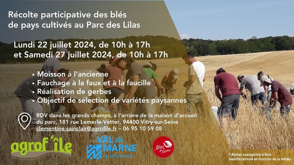 Ici, une parcelle "conservatoire de blés anciens et de pays" est entretenue par AgrofÎle et les jardiniers du parc départemental. Venez nous aider à récolter le résultat de ce travail ! L'objectif est double : mettre à disposition des semences pour les agriculteurs qui le demanderaient, et produire symboliquement de la farine du parc des Lilas.