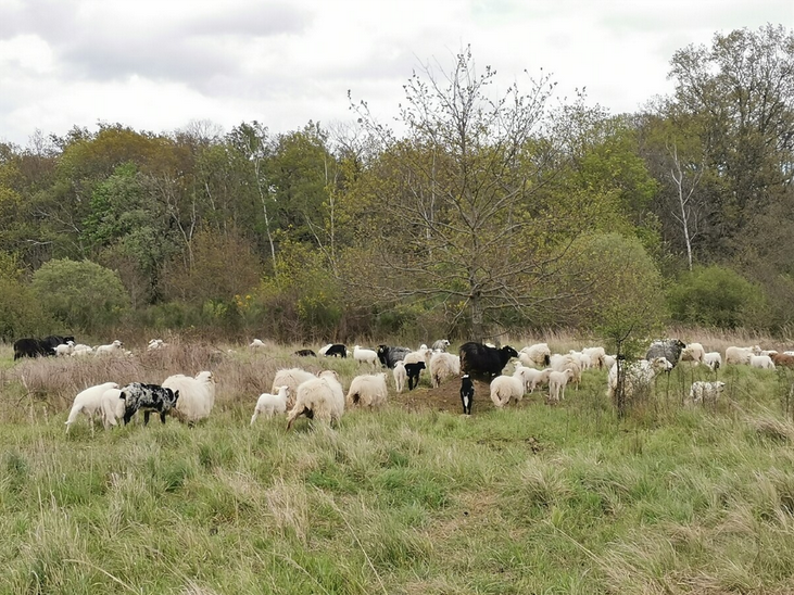 Quant aux 100 brebis de race corse d’Audrey, elles patientent en attendant une salle de traite et une fromagerie. Cette année, elles ont généralement agnelé de un à deux petits mais deux brebis ont eu des triplés. Elles sont dehors toute l’année, et ne craignent pas le froid, étant polygastriques (ce qui leur garantit une sorte de « bouilloire interne ») et avec une belle toison. Elles se nourrissent d’herbe dans les parcs d’environ un hectare. La rotation se fait à peu près tous les cinq jours, « pour ne pas fatiguer la prairie, qu’elle puisse redémarrer ». Dès septembre, les brebis partent pâturer les champs bio des céréaliers voisins qui sèment des couverts pour le printemps suivant.