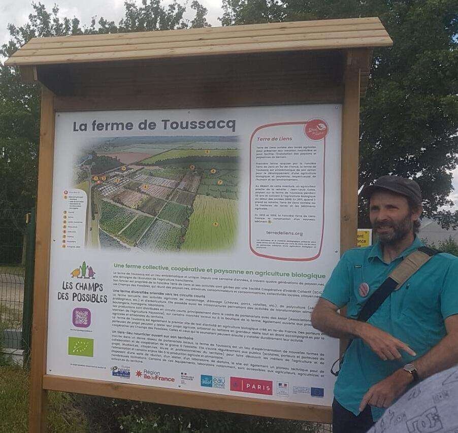 Saturnin, installé à Toussacq comme entrepreneur associé à la coopérative Les Champs des Possibles, a coordonné la réalisation de la maquette avec les paysans installés sur le site. Il présente le contenu du panneau et partage avec nous les anecdotes et questionnements qui ont traversé la réalisation du dessin : comment rendre lisible le projet de la ferme dans son ensemble, quels espaces valoriser, comment les nommer ? Accompagné par Isabelle, il nous guidera ensuite pour une visite de la ferme passionnante, à la découverte de son histoire, de ses espaces de travail et de vie au quotidien.