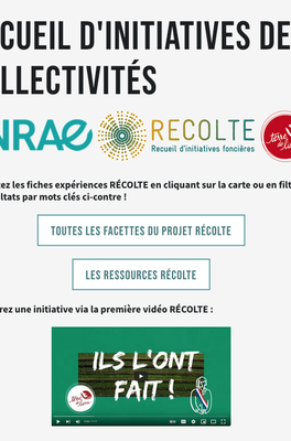 Un espace de partage de projets fonciers vertueux, réalisés avec des collectivités à l'échelle locale ou nationale et en partenariat avec INRAE. Le projet Récolte veut faciliter le passage à lʼaction foncière agricole des collectivités territoriales. Il s’organise autour de deux piliers: une plateforme internet pour capitaliser les expériences des territoires et l’animation d’une communauté d’échanges entre élus et agents de collectivités, chercheurs, et citoyens.