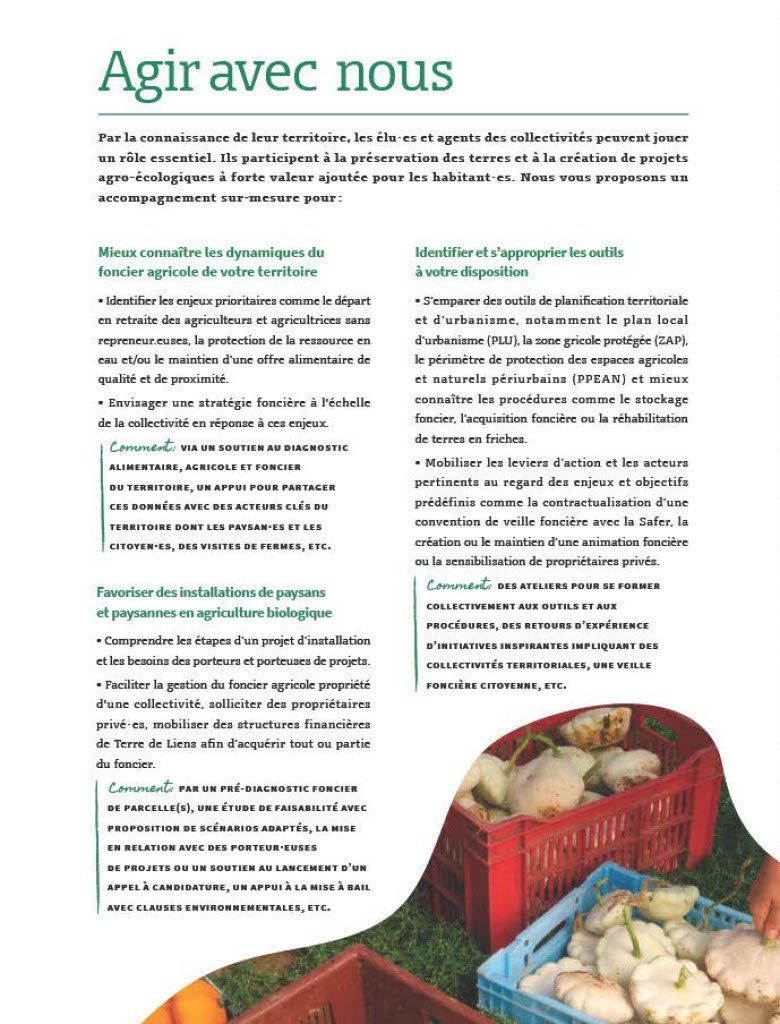 Fort de plus de 20 ans d’expérience et d’engagement pour la préservation du foncier agricole, le mouvement Terre de Liens accompagne aujourd’hui les collectivités territoriales dans la mise en place de leurs stratégies foncières agricoles, pour le développement d’une agriculture biologique et paysanne, en lien avec les territoires et leurs habitants.
