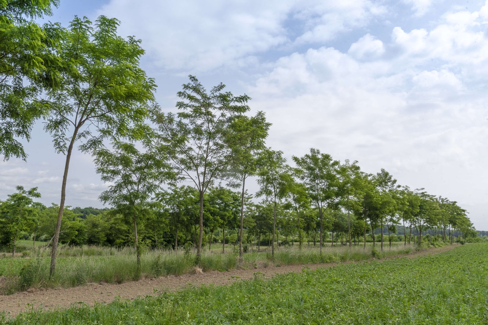 À la Fabrique Végétale, des fossés bordés d’arbres sont creusés sur la largeur our remplacer les drains. Sur les longueurs alternent des noues de 30 à 45 cm de profondeurs pour évacuer l’eau pendant les mois de fortes pluies. En parallèle, des bandes d’arbres choisis pour leur système racinaire non agressif sont plantés à 45 mètres des noues.