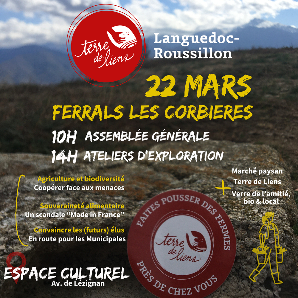 L'Assemblée Générale de Terre de Liens Languedoc Roussillon se tiendra le samedi 22 mars de 10h à 17h à Ferrals les Corbières dans l'Aude !