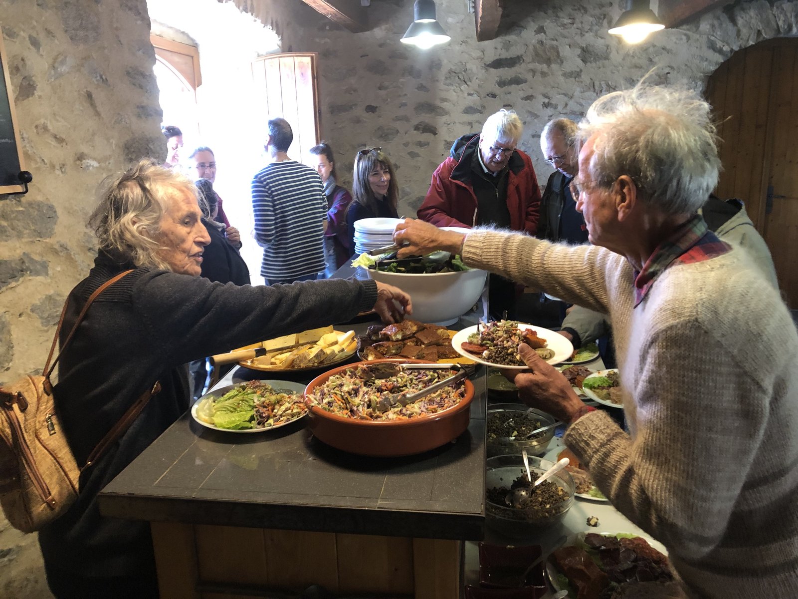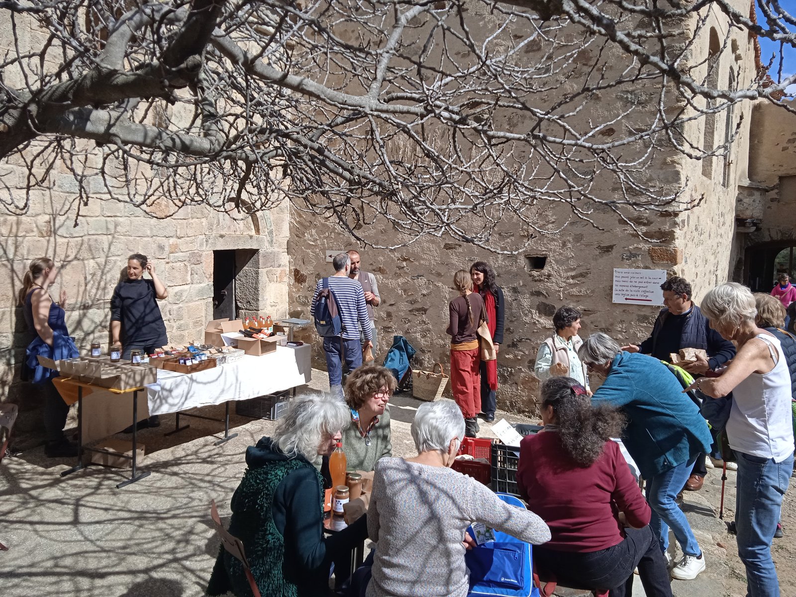 Les participants se sont retrouvés autour d'un buffet local préparé par l'équipe du Prieuré de Marcevol. Durant la pause, un marché paysan des fermes Terre de Liens était tenu dans la cour. Fromages de Serrabone, jus de pomme d’Echausses, terrines d’Auzillargues, pain de Thuronis, crème de marron de Malhaussette, vin de Villelongue dels Monts… Il y en avait pour tous les goûts ! Plus de 1000 € d'achats ont été réalisés: un véritable succès pour nos fermières et fermiers !