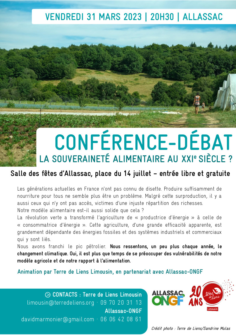Allassac-ONGF et Terre de Liens Limousin organisent le vendredi 31 mars à Allassac une conférence-débat autour de la souveraineté alimentaire de nos territoires.