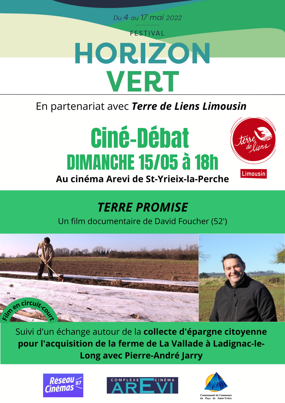 - Dimanche 15 mai à 18h : ciné-débat autour du film"Terre Promise" de David Foucher au cinéma Arevi de Saint-Yrieix-la-Perche (87), dans le cadre du festival Horizon Vert.