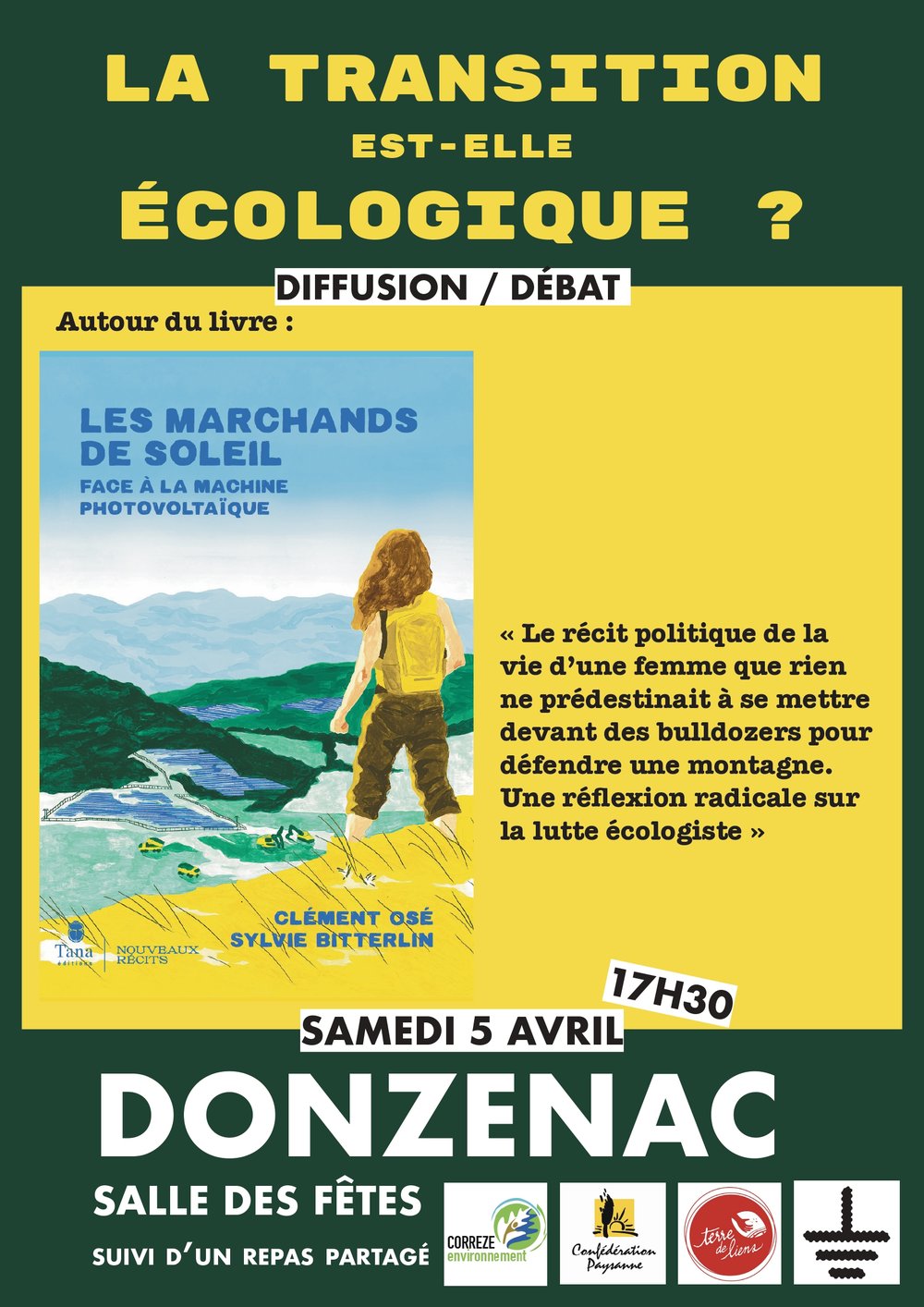 Terre de Liens Limousin, Corrèze environnement, la Confédération Paysanne et les Soulèvements de la Terre de Corrèze vous invitent à en discuter avec Clément Osé, co-auteur du livre Les marchands de soleil. Face à la machine photovoltaïque (2024) de Sylvie Bitterlin et Clément Osé.