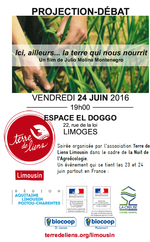 Vendredi 24 juin à 19h à l’espace « El doggo », 22 rue de la Loi à Limoges. Le débat sera introduit par le film « Ici, ailleurs.... la terre qui nous nourrit ». Et la soirée se conclura par une petite dégustation de produits biologiques issus des fermes que Terre de Liens Limousin a permis d’installer.