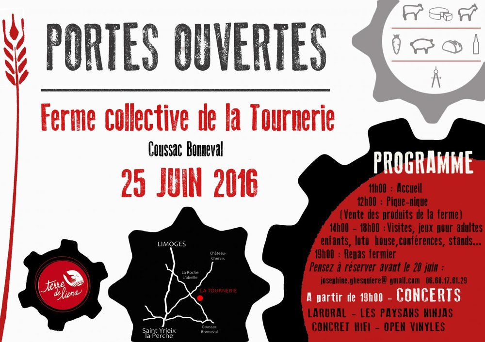 Quelques mois après leur installation officielle, l’heure est venue pour le collectif de la Tournerie de vous convier à ses portes ouvertes qui auront lieu le Samedi 25 juin 2016 à partir de 11h et jusque tard !