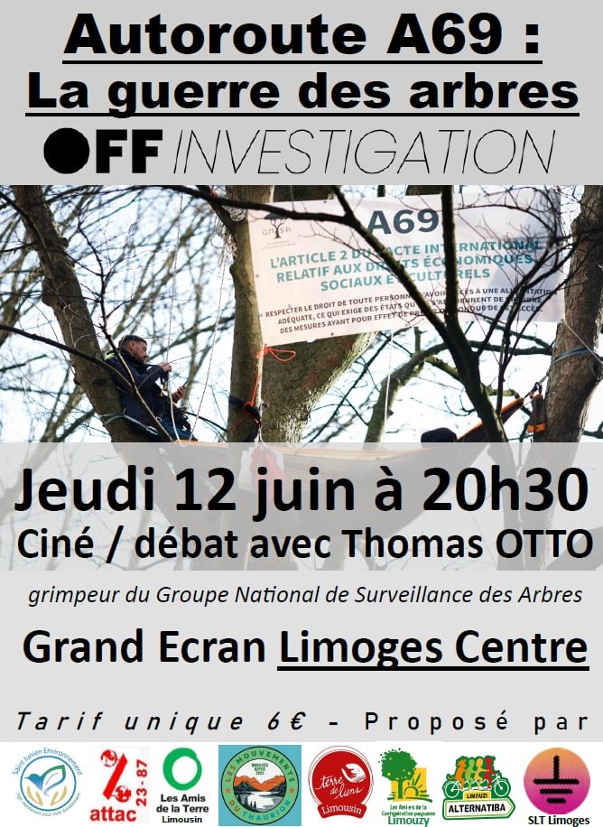 Rendez-vous le jeudi 12 juin à 20h30 au cinéma Grand Ecran à Limoges Centre pour une projection du documentaire "A69 : l'affaire personnelle de Macron" de Clarisse Feletin. La projection sera suivie d'un débat en présence de nombreuses associations du Limousin : les associations Saint-Junien Environnement, ATTAC 23-87, Les Amis de la Terre Limousin, Terre de Liens Limousin, Les Ami-e-s de la Confédération paysanne Limouzi, Alternatiba Limouzi, ainsi que les organisations les Soulèvements de la Terre Limoges et les Mouvements du Thaurion et en présence de Thomas Otto, grimpeur au sein du Groupe National de Surveillance des Arbres.
