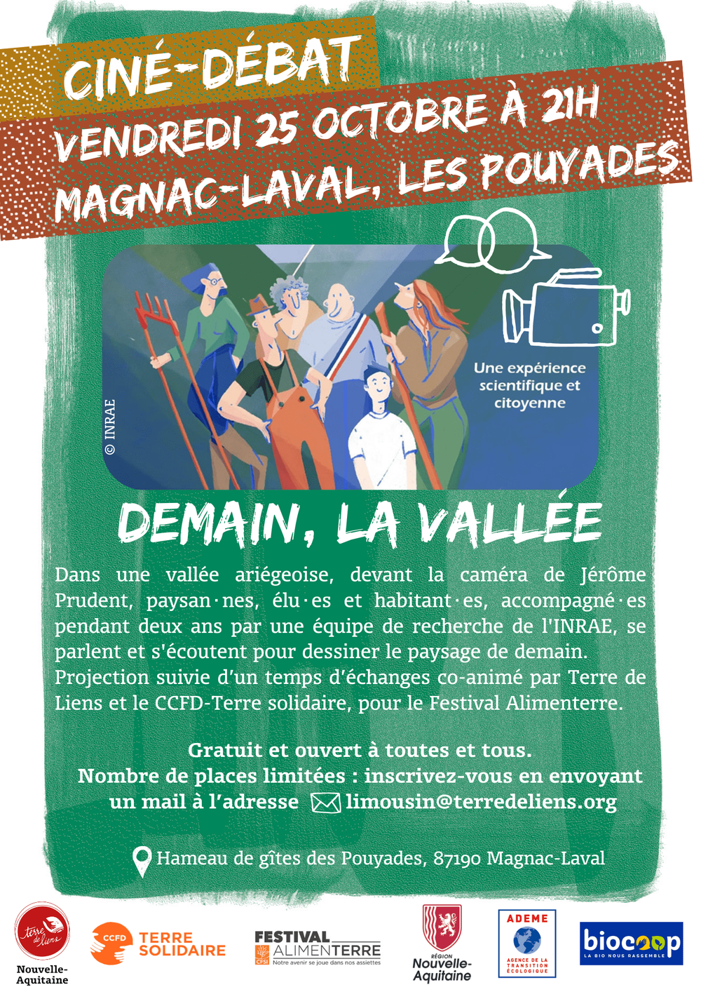 Pour l'ouverture des Journées Limousines des Bénévoles Terre de Liens, nous organisons avec le CCFD-Terre solidaire une projection-débat autour du film "Demain, la vallée" le vendredi 25 octobre à 21h à Magnac-Laval (Hameau de gîtes des Pouyades).