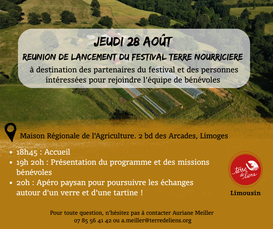 Pour découvrir le programme complet du festival et rejoindre l’équipe de bénévoles, retrouvez-vous le jeudi 28 août à partir de 18h45 à la Maison Régionale de l’Agriculture pour un temps d’échanges et d’informations.